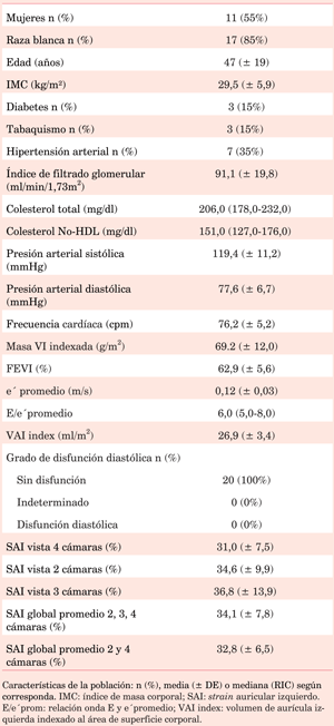 De los sujetos incluidos en el estudio, 11 (55%) fueron mujeres, 17 (85%) de raza blanca, con un promedio de edad de 47 (± 19) años, índice de masa corporal (IMC) de 29,5 (± 5,9) kg/m². La prevalencia de diabetes y tabaquismo fue de 15% (n=3), y el 35% (n=7) de los sujetos eran hipertensos, de los cuales 4 pacientes recibían tratamiento antihipertensivo.