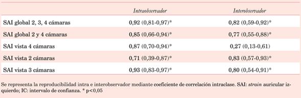 La reproducibilidad intraobservador e interobservador del SAI promedio de las vistas 2 y 4 cámaras fue buena, con un CCI de 0,85 (IC: 0,66-0,94) y 0,77 (IC: 0,55-0,88) respectivamente, p<0,0001.