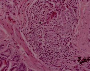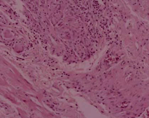 Figura 1: Granulomas tipo sarcoide, sin necrosis, en miocardio.