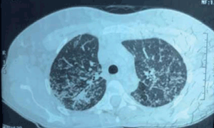 Figura 3: TC: micronódulos pulmonares bilaterales cisurales y subpleurales, engrosamiento intersticial.