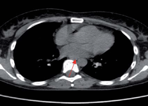 Figura 4: TC: adenopatías mediastinales (flecha).