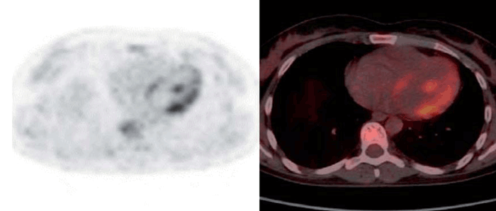 Figura 5: PET/TC: actividad metabólica cardíaca heterogénea y parcheada.