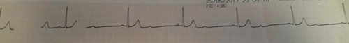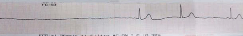 Figura 1: Bradicardia extrema de 30 cpm aproximadamente en contexto de bloqueo auriculoventricular 2:1.