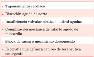 Tabla 1: El ecocardiograma de urgencia deberá ejecutarse durante la guardia, en ausencia de contraindicaciones, ante la sospecha de: