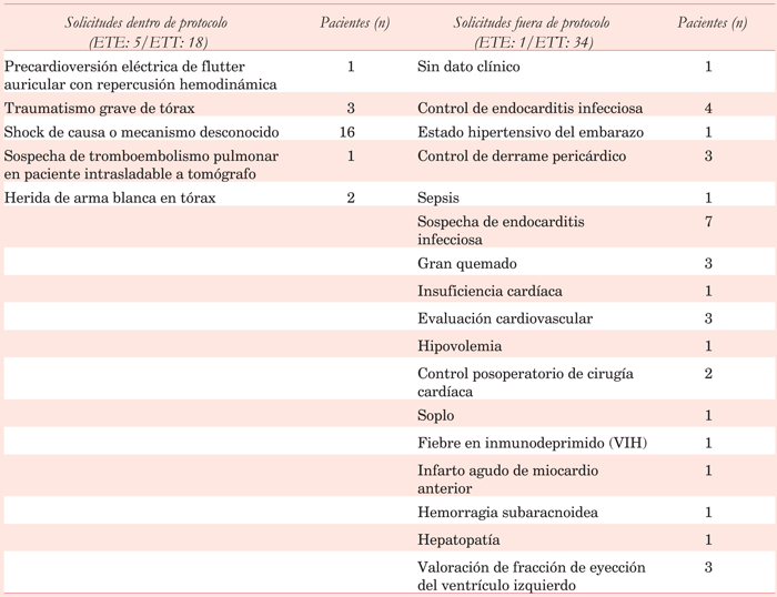 Teniendo en cuenta estos aspectos, creamos un protocolo de indicación de ecocardiograma de urgencia que fue avalado y aceptado por la dirección del hospital universitario y los responsables de los servicios de emergencia, centro de tratamiento intensivo, cuidados intermedios y unidad cardiológica (tabla 1).