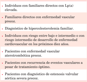 Se debe realizar la determinación de los niveles plasmáticos de Lp(a) en todos los familiares de un individuo con antecedente de Lp(a) elevada o enfermedad vascular aterotrombótica precoz.