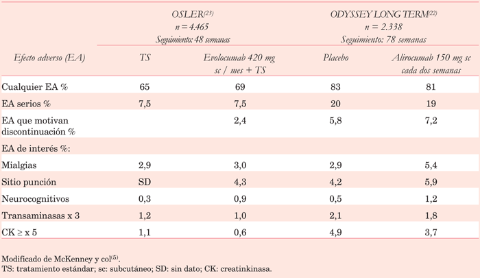 Tabla 6: Efectos adversos de los inhibidores de la PCSK9.