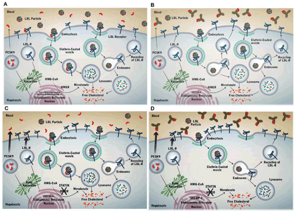 Ante la inhibición de la síntesis de colesterol, por ejemplo en respuesta al uso de estatinas, se produce una regulación en más de la síntesis de R-LDL y de la transcripción de PCSK9, en vistas a restaurar la reserva de colesterol (figura 1C)(5).