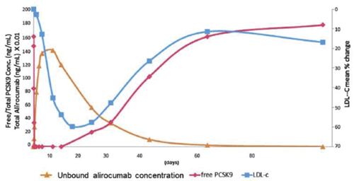 Los niveles de C-LDL comienzan a descender un día después de la administración de estos anticuerpos, alcanzando los niveles plasmáticos mínimos a los 14 días, ascendiendo progresivamente luego de este período. Esta cinética determina que el tiempo óptimo para repetir la dosis sea a los 14 días. Si no se administra una nueva dosis, los niveles plasmáticos de C-LDL vuelven a su punto de origen en aproximadamente 60 días (figura 2)(5).