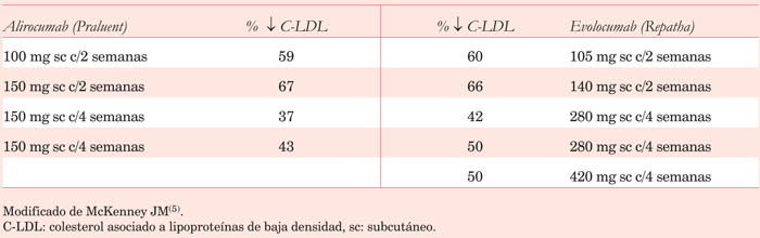 Tanto alirocumab como evolocumab determinan reducciones marcadas en los niveles plasmáticos de C-LDL. En la (tabla 2) se describen los porcentajes de descenso de C-LDL con ambos fármacos de acuerdo a la dosis y frecuencia de administración.