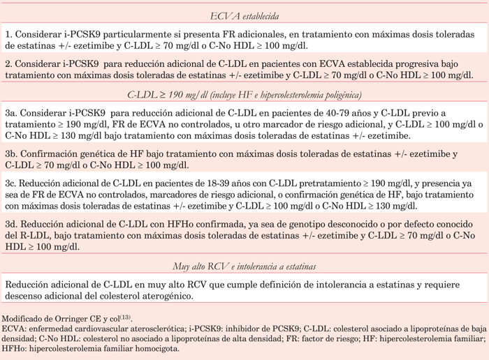 Las guías de la National Lipid Association (NLA) del año 2015(12) definieron las indicaciones de los i-PCSK9 y fueron revisadas en 2017 en base a la nueva evidencia disponible(13). En la tabla 3 se esquematizan las indicaciones de la NLA 2017, que no difieren demasiado de las guías europeas (tabla 4)(14).