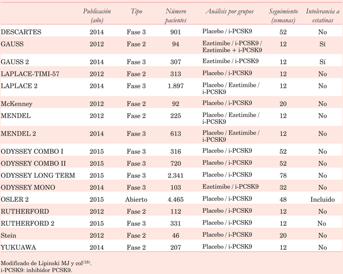 En un metaanálisis publicado en 2016 se incluyeron 17 ensayos clínicos controlados randomizados que compararon a los i-PCSK9 con otros hipolipemiantes en pacientes con hipercolesterolemia primaria. Se incluyeron más de 13.000 pacientes, randomizando a cuatro ramas: i-PCSK9, placebo, ezetimibe, i-PCSK9 + ezetimibe(18). La media de edad fue de 59 ± 10 años, 52% fueron hombres, 34% con enfermedad coronaria. La media de C-LDL fue de 122 ± 36 mg/dl.