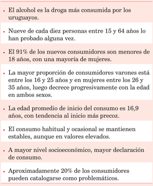 Nuestro país se encuentra en un nivel de consumo de alcohol mayor a la media mundial; globalmente el 57% de las mujeres y el 67% de los hombres son consumidores (un promedio entre dos y tres medidas regulares por día). La mayor prevalencia de consumo en Uruguay, superando el 70%, se registra en el grupo de 20 a 29 años en ambos sexos, cuya proyección es un motivo de preocupación adicional(1). En la tabla 2 resumimos los datos más relevantes de la VI Encuesta Nacional de Hogares sobre Consumo de Drogas 2016(4).