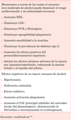 Las evidencias epidemiológicas muestran una compleja asociación entre el alcohol y las enfermedades cardiovasculares (cardiopatía isquémica, accidente cerebrovascular y miocardiopatía). Esta asociación está fuertemente vinculada a la cantidad y el patrón de consumo. El consumo de cantidades bajas o moderadas (una o dos ME) se ha relacionado a una menor morbimortalidad por patologías cardiovasculares, mientras que consumos mayores se han vinculado con un mayor riesgo cardiovascular(5) (tabla 3).