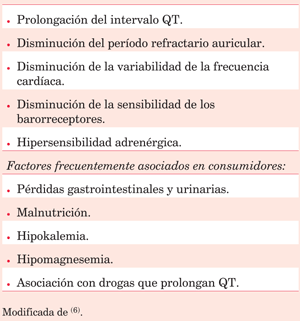 El alcohol ocasiona, además, en individuos sanos, una disminución de la variabilidad de la frecuencia cardíaca por disminución de la modulación vagal, hecho que también se objetivó en pacientes con EC y consumo agudo. También compromete la sensibilidad de los barorreceptores, ambos elementos favorecedores de la aparición de trastornos del ritmo. A su vez, los trastornos hidroelectrolíticos no son infrecuentes, sobre todo la hipokalemia y la hipomagnesemia, en ocasiones asociadas a malnutrición, y también predisponen a las arritmias(6) (tabla 4).