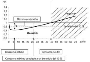 Dada la alta prevalencia de ambas condiciones en la sociedad, esta relación se ha transformado en un auténtico problema de salud pública. Mientras existe consenso en cuanto a los efectos perjudiciales del consumo excesivo de alcohol, aunque no particularmente por su relación con la EC, existe controversia en cuanto a los potenciales efectos beneficiosos de un consumo bajo o moderado. La relación entre consumo y riesgo cardiovascular (involucra EC), a diferencia de otros factores de riesgo cuya relación es lineal, se ha descripto, como ya mencionamos, como una curva en J(25) (figura 1). Considerando como punto de partida el riesgo relativo de quien no consume, el riesgo disminuiría con consumos leves y moderados, para luego aumentar progresivamente. Teóricamente, entonces, existiría un nivel de consumo que sería el óptimo. Diversos análisis epidemiológicos describen esta relación, aunque es muy cuestionada si se analiza en mayor profundidad la evidencia.