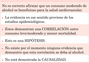 La principal dificultad para el establecimiento de recomendaciones definitivas con respecto al consumo moderado de alcohol deriva de que no existe una evidencia contundente basada en estudios clínicos randomizados. La mayoría de la información surge de estudios epidemiológicos observacionales, realizados en poblaciones de diferentes geografías, razas, con distintos patrones culturales y diversos hábitos dietéticos. Además, la debilidad en determinar el patrón de consumo de alcohol y su mantenimiento en el tiempo (habitualmente auto y subreportado), la edad, el sexo, la imposibilidad de seleccionar un grupo de control consistente, la variabilidad en la definición de los eventos, constituyen importantes limitaciones difíciles de superar aun con metaanálisis. Por otra parte, si se planificara un estudio aleatorizado, se definiera una población precisa y se valorara el consumo en detalle, los resultados no serían generalizables. Estas limitaciones no permiten conclusiones definitivas sobre el alcohol como factor independiente y, por lo tanto, establecer una relación causa-efecto definitiva. Quizá por estas razones muchos estudios muestran un efecto beneficioso sobre la EC, aunque otros no.