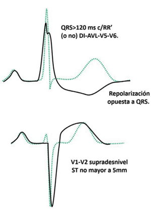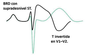 En el patrón de Brugada la recomendación se centra en el patrón tipo 1 (rSr’ cóncavo respecto a la línea de base, elevación del segmento ST 2 mm, inversión de la porción final de la onda T en V1, V2 y V3)(23,29). Su aparición obliga a revisar la correcta colocación de los electrodos V1 y V2 en el cuarto espacio intercostal. Aunque tanto los deportistas afrodescendientes como los de especialidades de resistencia pueden presentar cambios en la repolarización similares al patrón de Brugada tipo 2, en ausencia de síntomas o historia familiar de interés, no se recomienda realizar estudios adicionales.