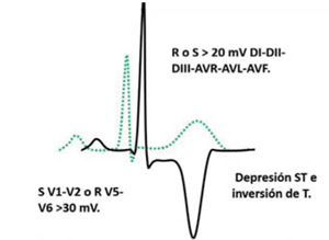 La depresión del segmento ST (relativa al segmento PR isoeléctrico) > 0,5 mm en dos o más derivaciones es un hallazgo anormal que aparece con frecuencia en la MCH. Se debe realizar al menos un ecocardiograma e incluso puede considerarse realizar RMC.