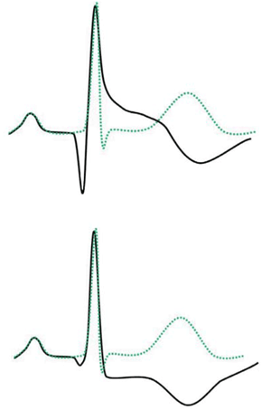 La inversión de la onda T es una de las alteraciones de más relevancia clínica en la interpretación del ECG. La T invertida de localización lateral o inferolateral (se precisa solo una derivación en V5, V6, DI o AVL) es siempre anormal y se asocia con miocardiopatía latente o miocarditis(29). Se debe estudiar minuciosamente a los deportistas con estas anomalías, realizando siempre una resonancia magnética cardíaca (RMC) si el ecocardiograma no resulta diagnóstico, Holter y ergometría. El estudio familiar es recomendable.