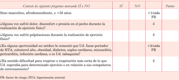 Los factores de riesgo CV, tal como lo plantea el American College of Sports Medicine y la Sociedad Brasilera de Medicina Deportiva, conducen a estudios adicionales en el caso de ser por lo menos dos(21,23,30,31), por esta razón le adjudicamos 2 puntos a cada uno (al sumar 4, debe derivarse a evaluación por especialista).