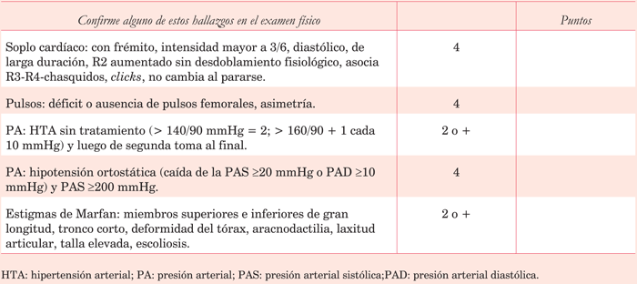 Los individuos con estigmas de enfermedad de Marfan tienen mayor probabilidad de ectasia aórtica, y por lo tanto, de disección y MSD. A mayor expresión fenotípica mayor probabilidad de sospecha y captación. Optamos por agregar puntos a partir de 2 en función del número de anormalidades presentes, partiendo de 2 puntos cuando el individuo impresiona tener igual envergadura que talla (rango envergadura/talla >1,05) y agregando de a 1 por anormalidad del tórax, signo de Walker Murdoch, hiperlaxitud, dientes acuminados, escoliosis y trastornos de visión. Se trata de aquellos criterios diagnósticos mayores y menores de interpretación más accesible que nos permiten acercarnos al diagnóstico.