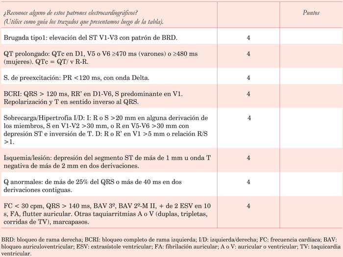 Ciertos ítems tienen tal importancia que de ser positivos, aun en forma aislada, implican la necesidad de suspender la actividad deportiva para profundizar el diagnóstico. Son situaciones de probado riesgo de MSD, por ejemplo, síncope durante el ejercicio (presente en 25%-50% de los casos previo a la misma), soplo orgánico (cardiopatía estructural de base), o hallazgos en el ECG que configuren una anormalidad en deportistas (Criterios refinados de Seattle). Definimos cuatro categorías de riesgo para todos los ítems y estas situaciones reciben 4 puntos (puntuación máxima de riesgo), debiendo derivarse el sujeto a especialista para completar su valoración de riesgo de MSD.