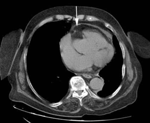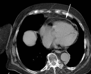 Figura 2: Tomografía de tórax sin contraste que muestra derrame pericárdico leve.