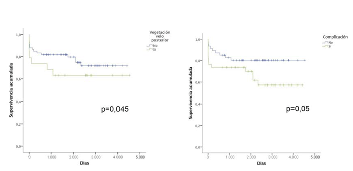 Figura 6: Sobrevida. Según la presencia de vegetación en el velo posterior de la válvula mitral (izquierda). Según la presencia de complicaciones locales (derecha).