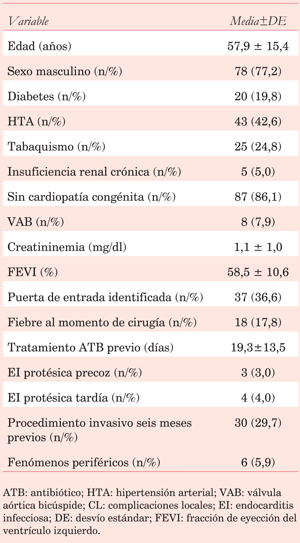 Resultados: cento e um pacientes foram incluídos. Staphylococcus aureus foi o microrganismo mais frequente (15,8%). A topografia foi protética em 20,8%, aórtica 46,5%, mitral 23,8% e mitroaórtica 13,9%. A mortalidade operatória foi de 11,3% e 29,5% (p = 0,025), de acordo com a ausência ou presença de complicações locais, o único preditor independente de mortalidade (OR). Um 47,5% apresentaram complicações locais, sendo o mais frequente o abscesso (25,7%). Os preditores independentes foram: endocardite protética (OR = 5,8), endocardite valvar aórtica (OR=2,9)) e sexo masculino (OR = 3,5). A incidência de endocardite protética precoce foi de 3% e tardia de 4%. Trinta por cento dos pacientes adquiriram endocardite infecciosa como resultado de um procedimento médico invasivo nos 6 meses anteriores. Dos pacientes com endocardite protética na evolução, 85,7% apresentava complicações locais (p <0,05). O 31,7% apresentava embolia, resultando em preditores independentes: Staphylococcus aureus (OR = 4,6), vegetação no véu mitral posterior (OR = 3,2) e história de hipertensão arterial (OR = 3,32). A sobrevida em 5 e 10 anos foi de 88,20% ± 0,04 e 81,50% ± 0,05, respectivamente.