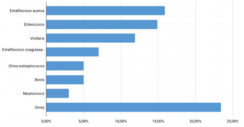 La microbiología de la enfermedad también se ha visto modificada. La incidencia de la EI causada por SA ha aumentado, siendo actualmente el agente etiológico más común en la mayor parte del mundo industrializado, incluyendo el registro argentino EIRA 3(5). La aparición de EI por SA se vincula a los cuidados en salud (contacto hospitalario, procedimientos y dispositivos invasivos) como principal factor de riesgo, además del uso de drogas intravenosas. En contraste con los estreptococos, el SA no requiere la presencia de enfermedad valvular preexistente para determinar la infección(17). La importancia de este patógeno potencialmente letal es motivo de preocupación dada la creciente resistencia antimicrobiana(18), incluso a la vancomicina(19). En nuestro estudio, SA fue también el principal microorganismo causal (15,9%). Siguieron en frecuencia: enterococo y viridans. El enterococo afecta habitualmente a pacientes ancianos con comorbilidades, y es más frecuente la adquisición nosocomial, la cual se asocia a peores resultados. La tasa de mortalidad reportada por este agente es intermedia entre la de estreptococos y la de estafilococos(20).