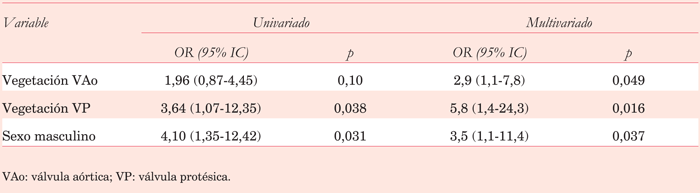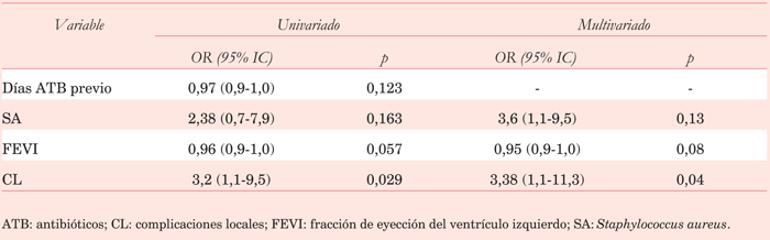 La MO global fue de 19,8%, siendo mayor en pacientes con CL (29,2% vs 11,3% sin CL, p=0,025), única variable asociada a MO luego del análisis multivariado (OR=3,38; IC95%: 1,0-11,3) (tabla 2). La incidencia de CL fue de 47,5%, siendo el absceso la más frecuente (25,7%). La EP (OR=5,8; IC95%: 1,4-24,3), endocarditis sobre válvula aórtica (OR=2,9; IC95%: 1,1-7,8) y sexo masculino (OR=3,5; IC95%: 1,1-11,4) se asociaron a CL tras el análisis multivariado (tabla 3).