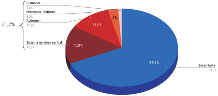 Se observó 20,8% de EI sobre VP, similar a lo observado por Hoen B y colaboradores (16%)(9), y en el Euro Heart Survey (26%) (21). Dentro de las infecciones sobre válvula nativa, la principal localización fue sobre válvula aórtica (VAo) (46,5%), seguida de la válvula mitral (VM) (23,8%). Nuestros resultados son similares a lo observado en el EIRA 3 (VAo 46% - VM 33% - VP 20,7%). En ICE-PCS se observó EI sobre VP en el 22,2%, seguida por la infección sobre VM (41%) y VAo (38%). Se encontró una elevada incidencia de complicaciones de EI, como embolias o CL. El 31,7% de pacientes sufrió embolias, siendo la principal localización el sistema nervioso central, similar a lo reportado en EIRA 3 y en ICE-PCS (32,1% y 40%, respectivamente).