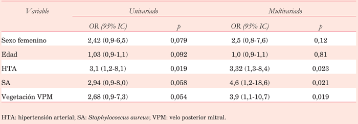 La incidencia de embolias fue 31,7%, localizadas principalmente en el sistema nervioso central (figura 4). Se asociaron a mayor riesgo de embolia: sexo femenino, edad, antecedente de hipertensión arterial (HTA), identificación de SA en HC y presencia de vegetaciones sobre valva posterior de la válvula mitral, pero luego del análisis multivariado resultaron predictores: SA en HC (OR=4,6; IC95%: 1,2-18,6), vegetación en el velo mitral posterior (OR=3,9; IC95%: 1,1-10,7) y antecedente de HTA (OR=3,32; IC95%: 1,3-8,4) (tabla 4). La incidencia de EP precoz fue de 3%, y tardía de 4%. De los siete pacientes con EP en la evolución, seis tuvieron CL en la presentación inicial (p<0,05). Debido a la baja incidencia de EP en la evolución, no se lograron identificar predictores independientes.
