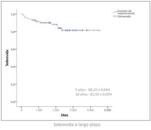 La MO global registrada en estudios internacionales es alta (12%-22%)(5). En nuestra población fue 19,8%, siendo mayor en pacientes con CL (29,5% vs 11,3%, p=0,025). La única variable que vimos asociada a mayor MO, luego del análisis multivariado, fue la presencia de CL (OR=3,38; IC95%: 1,1-11,3). Adicionalmente, encontramos que las CL aumentan el riesgo de EP en la evolución. En las series recientes, las tasas de supervivencia a largo plazo se encuentran en 60%-70% a los cinco años(29-31). En diez años de seguimiento la supervivencia fue de 74,8% en el estudio de Pang PY y colaboradores(32). En nuestra población, la sobrevida global a cinco y diez años fue mayor que la reportada, 88,20% y 81,50%, respectivamente (figura 5).