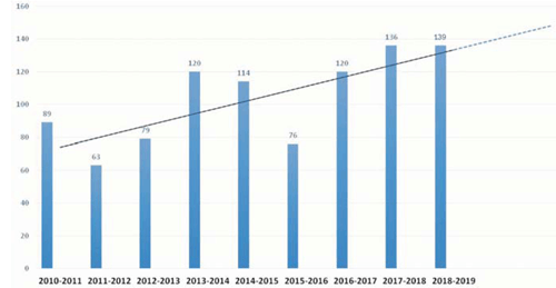 El servicio cuenta con una sala de electrofisiología de uso exclusivo, con disponibilidad continua para realizar implantes de MCP. El volumen de procedimientos vinculados a dispositivos (200-300/ año) puede considerarse como medio-alto(3), al que deben sumarse los procedimientos de ablación por catéter y otros. En la (figura 1) se muestra el progresivo aumento en el número de procedimientos/año, a excepción de 2015, con un descenso temporal debido a reformas.