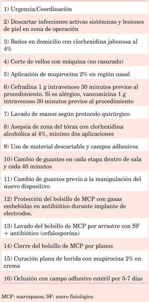 Se utilizó un protocolo estricto para la prevención de complicaciones infecciosas desarrollado en conjunto con el comité de infecciones, diferenciando implantes de urgencia y de coordinación. En la coordinación se indican al paciente dos a tres baños con jabón de clorhexidina al 4% en las 24 horas previas al procedimiento. Los pasos posteriores no se diferencian para los procedimientos de coordinación y urgencia. El lavado se reitera en la antesala, además de la aplicación de mupirocina nasal. No se realiza rasurado. De existir vello abundante sobre el sitio quirúrgico, se recorta con máquina eléctrica. Se administra antibiótico profiláctico 30 minutos antes del inicio del implante, habitualmente una cefalosporina de primera generación por vía endovenosa. Una vez en sala, se procede a la asepsia de la piel con clorhexidina alcohólica al 4%, colocación de campos y batas descartables, y campo adhesivo para el sitio quirúrgico. Una vez preparado el campo operatorio y la mesa de instrumental, el operador se cambia de guantes, lo cual reitera si el procedimiento dura más de 40 minutos, y obligatoriamente previo a la manipulación del generador. El embalaje del MCP solo es abierto en el momento de conectarlo a los electrodos. Durante el tiempo de posicionamiento y medidas de los electrodos, se deja una gasa embebida en solución fisiológica y antibióticos (cefalosporina de primera generación) en el bolsillo del MCP. Previo a alojar el generador, se realiza lavado por arrastre con suero fisiológico y antibiótico, revisándose minuciosamente la hemostasia. Luego del cierre por planos, se realiza cura plana con uso de mupirocina en crema sobre la incisión. Esta se ocluye con campo adhesivo, el cual se mantiene por cinco a siete días. Este protocolo se resume en la (tabla 1). Los pacientes se controlan previamente al alta entre los 10 a 14 días del implante, cuando se extraen los puntos de sutura y se controla la herida, luego a los 3, 6 y 12 meses. Posteriormente, el control se realiza de forma anual hasta que comienza a declinar la batería, desde entonces los controles se vuelven más frecuentes, hasta el recambio.