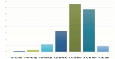 La mediana de edad en los primo-implantes fue de 77 años (16-99) y en los recambios de generador de 79 años (24-98). En el análisis por décadas, el mayor número de implantes se realizó entre los 70-79 años (37,9%), seguido en forma decreciente por las décadas entre 80-89 (33,5%), 60-69 (16,2%) y 50-59 (5,8%). En pacientes mayores de 90 años los implantes fueron 4,3% y en menores de 50 años 2,0% (figura 3).