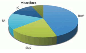 El diagnóstico más común que motivó el implante fue el bloqueo auriculoventricular (BAV) en 49,9% de los casos, a expensas de BAV de alto grado (44,7%) y fibrilación auricular (FA)/flutter asociado a BAV de tercer grado (5,2%). La enfermedad del nódulo sinusal (ENS) es el segundo diagnóstico más frecuente, con el 30,5% de los casos, incluyendo la FA con alta tasa de BAV (11,5%). El bloqueo de rama o trastorno de conducción intraventricular representó el 3,6% de los casos. La hipersensibilidad del seno carotídeo correspondió a 0,4%. Los pacientes con insuficiencia cardíaca e indicación de resincronización representaron el 12,3% del total. En 3,7% no se especificó la causa del implante (figura 4).