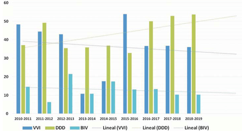 Figura 5: Evolución del modo de estimulación (%). VVI: ventricular; DDD: auriculoventricular; BIV: biventricular.