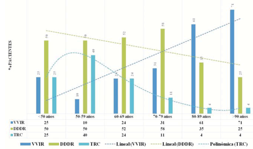 La edad condicionó el modo de estimulación elegido. En los pacientes octogenarios el modo más frecuentemente indicado fue VVIR, independientemente del ritmo de base. En cambio, en los menores de 80 años predominó la estimulación DDDR y TRC-P (figura 6).