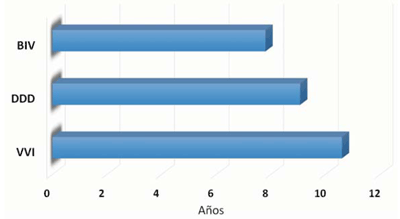 Figura 7: Longevidad promedio según modo estimulación. VVI: ventricular; DDD: auriculoventricular; BIV: biventricular.
