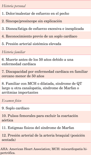 El principal aporte de esta guía consistió en sistematizar la clínica en 12 puntos “de alerta”, ocho del interrogatorio y cuatro del examen físico, que en caso de ser positivos debían determinar una evaluación CV más profunda, conocidos como los “12 pasos de la AHA”(37) (tabla 1).
