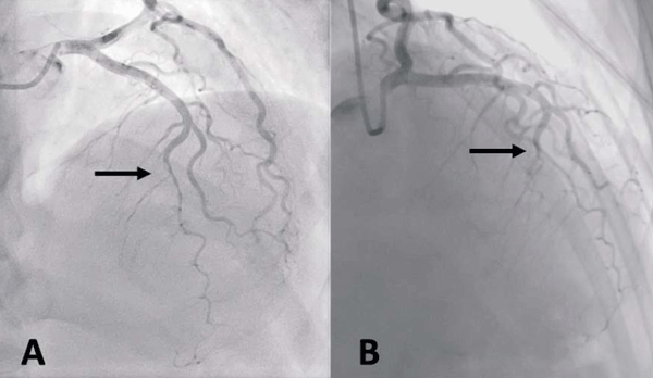 Figura 1: Coronariografía en proyección craneal anteroposterior (A) y craneal derecha (B) que muestran la reducción abrupta de la luz arterial (flechas).