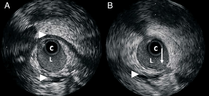 Figura 2: Ultrasonografía intracoronaria. A) Hematoma mural circunferencial (puntas de flecha). B) Desgarro intimal (flecha) y hematoma circunferencial (punta de flecha). L: luz arterial. C: catéter.