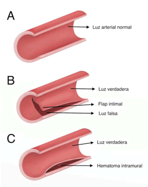 Figura 3: Mecanismos de disección coronaria espontánea. A) Arteria normal. B) Desgarro intimal y luz falsa. C) Sangrado espontáneo de la pared arterial y hematoma intramural.