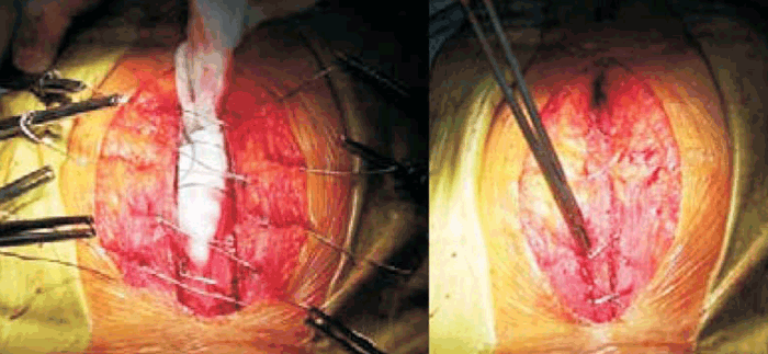Figura 9: Izquierda: hilos de alambre de acero de esternorrafía uniendo ambas mitades del esternón. Una compresa por detrás del plano óseo separa y protege al corazón durante el pasaje de los alambres. Derecha: alambres traccionados y torneados, aproximando ambas mitades del esternón con correcta aposición.