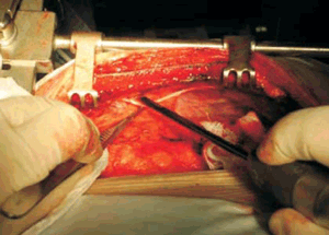 Figura 1: Se observa la cosecha de la arteria mamaria interna esqueletizada. El separador metálico tracciona de la pared anterior del hemitórax izquierdo hacia arriba para poder exponer el recorrido céfalo-caudal de la arteria, detrás de la parrilla costal.