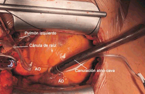 Figura 3: Abordaje cardíaco a través de esternotomía media clásica desde la posición del cirujano actuante. La cánula de la izquierda corresponde a la canulación de la aorta ascendente próxima al cayado. La cánula de la derecha está ingresando a la aurícula derecha y posteriormente se dirige hacia la cava inferior. La cánula de menor calibre situada entre las anteriores corresponde a la canulación de la raíz de la aorta y puede utilizarse para infundir cardioplejia y purgar aire de las cavidades. AO: aorta ascendente; AD: aurícula derecha.