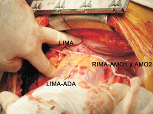 Figura 4: Se observan las dos arterias mamarias internas (en este caso esqueletizadas) utilizadas como conductos para realizar los bypass. La arteria mamaria izquierda ingresa al pericardio desde la pleura izquierda pasando a través de los dedos del cirujano. Una vez que ingresa a la cavidad pericárdica, se le anastomosa en "Y" invertida la arteria mamaria derecha. Más distalmente se observan las anastomosis sobre las arterias coronarias descendente anterior y dos arterias marginales. LIMA: arteria mamaria interna izquierda; LIMA-ADA: anastomosis de la LIMA a la arteria descendente anterior; RIMA-AMO1 y AMO2 corresponde al bypass secuencial con arteria mamaria interna derecha con primera y segunda arterias marginales obtusas.